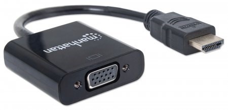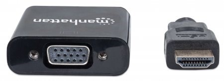 The Manhattan HDMI to VGA Converter helps establish a fast, simple and convenient link between newer HDMI-equipped desktop and notebook computers and other media sources with existing VGA monitors, projectors and other display devices. The Manhattan HDMI to VGA Converter is easy and quick to install and requires no complicated configuration or setup to help extend the service life and fully realize the investment and value of legacy VGA displays, projectors and other equipment. This low-power, cost-effective and reliable solution allows users to transition to HDMI bandwidths, resolutions, Deep Color and more without the expense of upgrading to newer and costly monitors and projectors. Its integrated, all-in-one design helps achieve a compact, integrated solution that eliminates unnecessary cables, tangles and clutter to keep installations and work spaces neat and orderly. Its Micro-USB port allows for additional power if required.