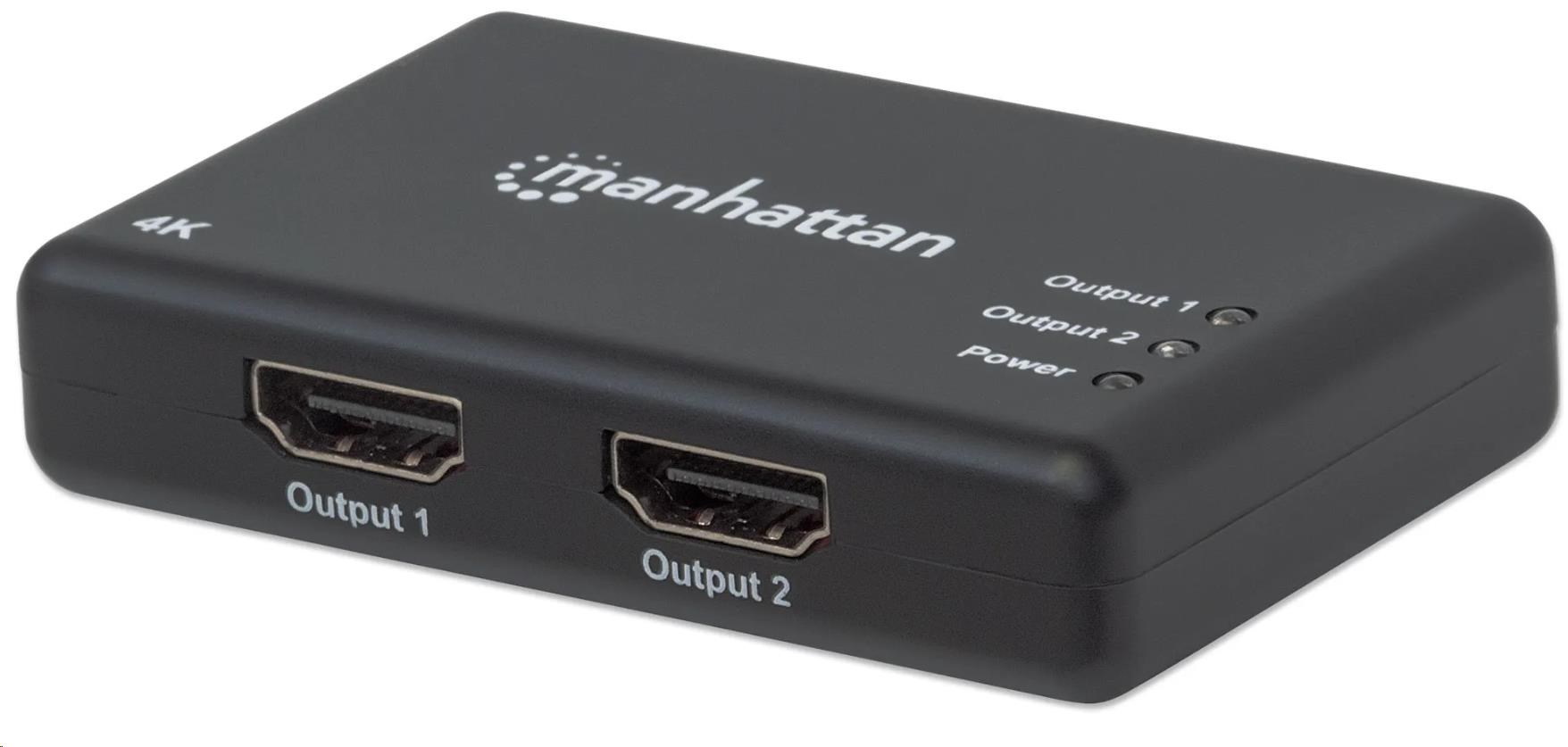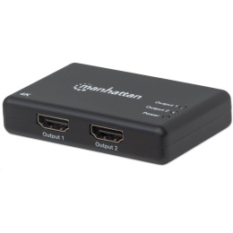 The Manhattan 4K 2-Port HDMI Splitter with built-in booster streams a 4K HDMI signal from a single UHD source to up to two UHD displays.