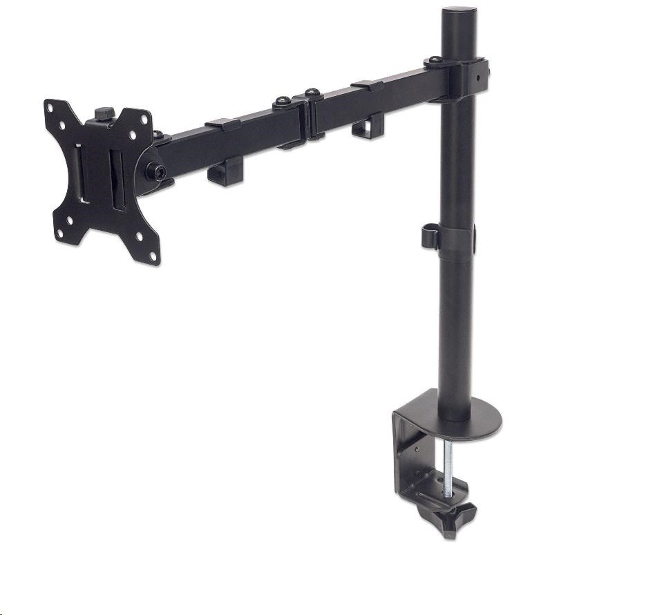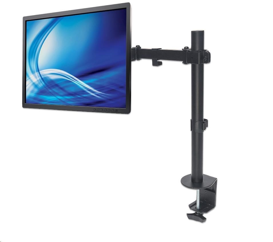 LCD-monitor installation above the desk helps maximize the effectiveness of a potential workspace. The Manhattan Universal Monitor Mount with Double-Link Swing Arm improves organization on the desktop, making it easier to get work done on the computer.