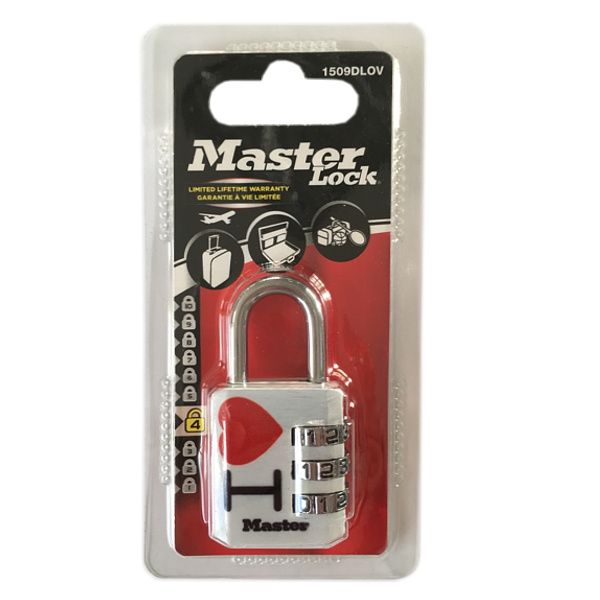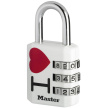 Master Lock Kombinační visací zámek 1509EURDLOV - 30mmVisací kombinační zámek 1509EURDLOV je široký 30mm. Ocelový třmen o průměru 5mm je dlouhý 22mm. Vlastní nastavení 3-místné kombinace zámku. Barva: bílá, motiv "I love". Cena za kus..