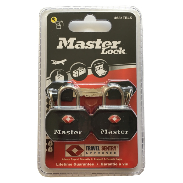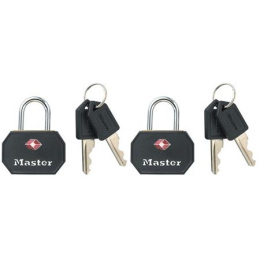 Master Lock Visací zámek TSA - černý (2 ks / blistr)Set 2 ks visacích zámků o šířce 30 mm pro zavazadla schválen agenturou TSA. Hliníkové tělo zámku má ABS ochranný obal, jeho třmen z oceli o průměru 3 mm je odolný proti přeřezání a přestřižení. Součástí balení jsou 4 ks klíčů. Barva černá. Cena za set..
