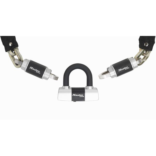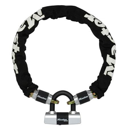 Master Lock Zámek na kolo 8239EURDPRO -Řetěz z kalené oceli s oky s čtvercovým profilem o průměru 10 mm má třmen z kalené oceli s osmiúhelníkovým profilem o průměru 16 mm. Nylonový potah řetězu zabraňuje poškrábání laku. Hmotnost řetězu je 2,7 kg..