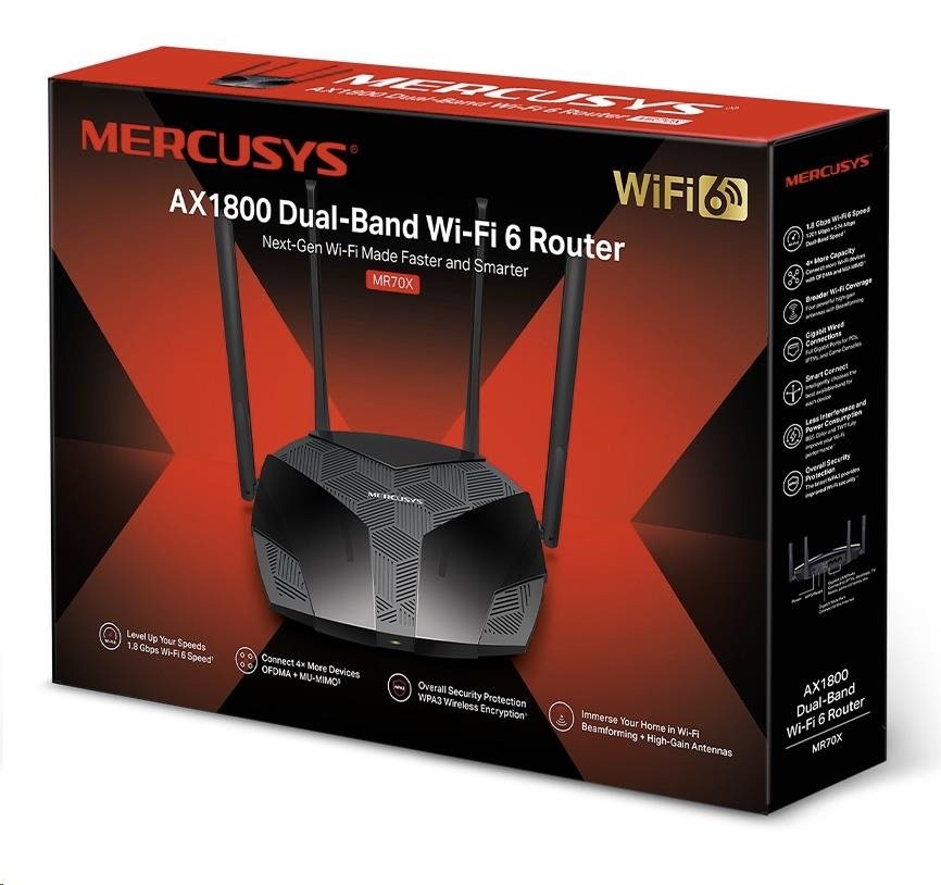 MERCUSYS MR70X Aginet WiFi6 router (AX1800, 2,4GHz/5GHz, 3xGbELAN, 1xGbEWAN)Typ aktivního prvku:Wifi Router, MU-MIMO; Frekvenční pásmo (GHz):2,4, 5, 2,4 + 5 (Dual Band); Podporované standardy:802.11ax, 802.11b/g, 802.11b/g/n, 802.11b, 802.11a, 802.11g, 802.11a/n, 802.11n, 802.11ac; Zabezpečení:WPS, WPA-PSK, WPA2-PSK, WPA3; Typ antény:Vestavěná; Použití:Vnitřní; Počet portů LAN:3; Počet WAN portů:1.