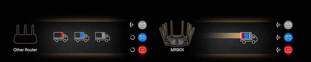 V nitru routeru Mercusys MR90X se nachází robustní čtyřjádrový procesor s frekvencí 1,6 GHz, který dokáže pracovat s obrovskou datovou propustnost, čímž je zajištěn hladký souběžný běh mnoha úloh náročných na šířku pásma. To vše s možností připojení až 256 zařízení naráz.
