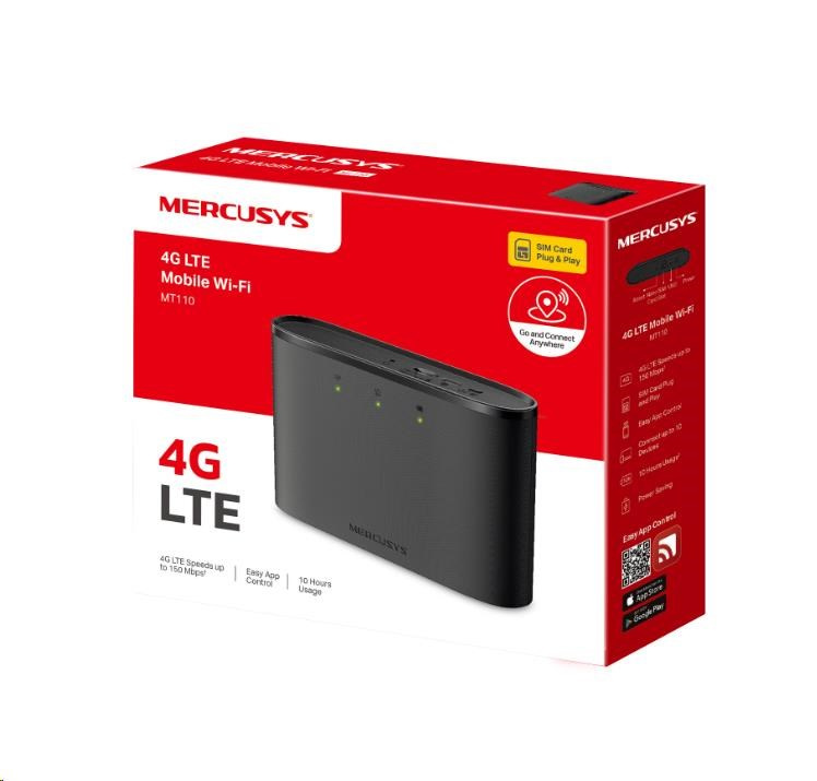 Mercusys MT110 WiFi4 4G LTE router (N150, 4G LTE, 2,4GHz, 1xnanoSIM)Typ aktivního prvku:Wifi Router; Frekvenční pásmo (GHz):2,4; Podporované standardy:802.11b/g, 802.11b/g/n, 802.11b, 802.11g, 802.11n; Zabezpečení:WPA-PSK, WPA2-PSK; Typ antény:Integrovaná; Slot na SIM kartu; Použití:Vnitřní; Další vlastnosti:Podpora 4G/LTE, Podpora 3G.
