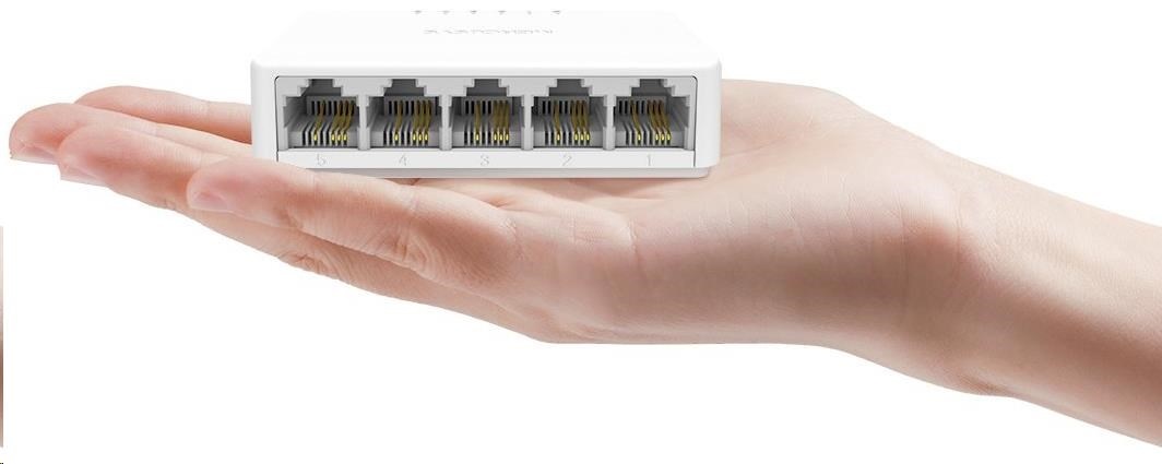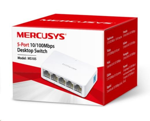 MERCUSYS switch MS105 (5x100Mb/s, fanless)Provedení:Desktop; Technologie:Fast Ethernet 10/100Mbps; Počet portů LAN:5; Přenosová rychlost LAN (Mb/s):100; Maximální počet portů:5.