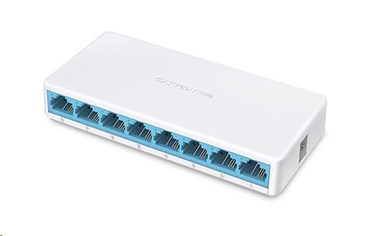 MERCUSYS switch MS108 (8x100Mb/s, fanless)Provedení:Desktop; Technologie:Fast Ethernet 10/100Mbps; Počet portů LAN:8; Přenosová rychlost LAN (Mb/s):100; Maximální počet portů:8.