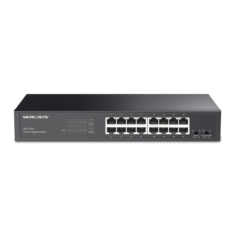 MERCUSYS switch MS116GS (16xGbE, fanless)Provedení:Desktop, Rack mounted 19"; Technologie:Gigabit Ethernet 1000Mbps; Počet portů LAN:16; Maximální počet portů:16; Přenosová rychlost LAN (Mb/s):1000.