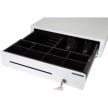 cash drawer, front opening, dimensions (WxHxD): 410x114x415mm, insert: 6 note compartments, 8 coin compartments, 1 receipt compartment, direct printer connection, RJ12, colour: white.