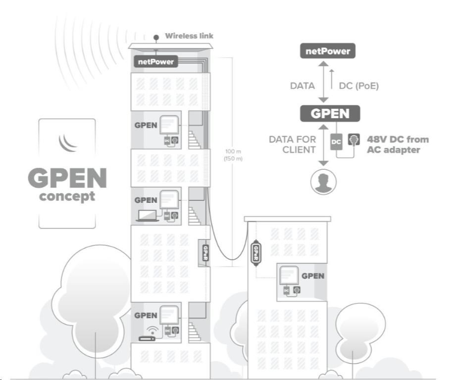 GPEN21 has an Ethernet and SFP port for fiber connectivity. Customers can choose to use GPEN21 to power optical module for uplink to provider, or to provide PoE to power Ethernet uplink to provider (that uses our GPeR and/or netPower products) The GPEN unit can be securely attached to a wall or the communications cabinet. The Ethernet cable can be routed either directly through its bottom cable opening or into the wall, as preferred.