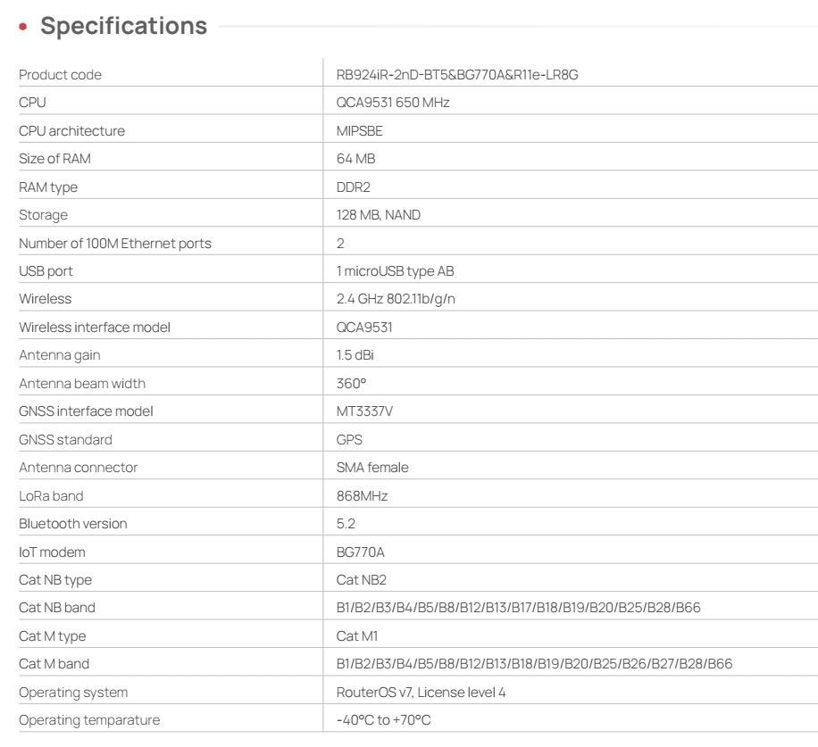 MikroTik RB924iR-2nD-BT5&BG770A&R11e-LR8G IoT Gateway KNOT LR8G kitPočet portů LAN:2; Slot na SIM kartu.