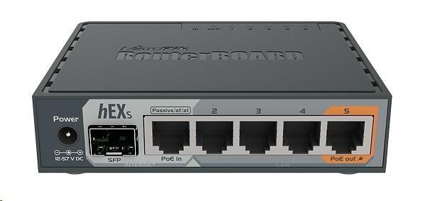 RB760iGS neboli hEX S je 5-portový Gigabitový router pro místa, kde není zapotřebí bezdrátové připojení. Ve srovnání s obyčejným hEX modelem má model hEX S také port SFP a výstupní PoE-Out na portu č.5.