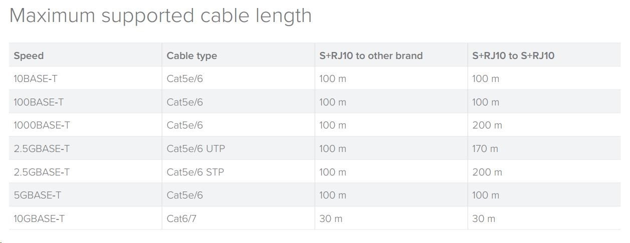 | 2.5GBase-T | Cat5e/6 UTP | 100m | 170m |