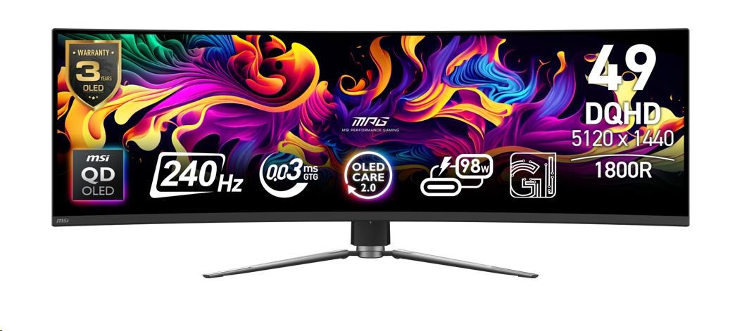MSI LCD MPG 491CQPX QD-OLED, 49", 5120x1440, QD-OLED, 0,03ms, VESA 100x100, BlackRozlišení displeje:5120x1440; Úhlopříčka displeje ("):49; Výbava:VESA montáž; Doba odezvy (ms):0.03; Typ panelu:QLED; Obnovovací frekvence displeje (Hz):240; VESA rozměry:100x100; Hmotnost (kg):10.6; Rozhraní:Jack 3,5 mm výstup, HDMI, USB 2.0, DisplayPort, USB Type-C.