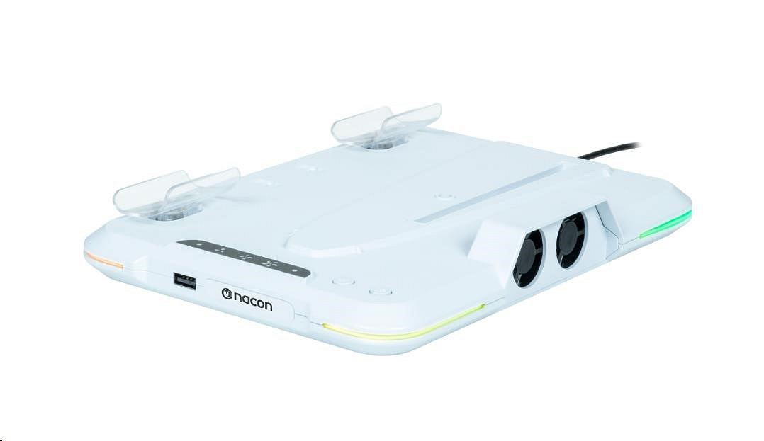 Na podstavci, k jehož napájení z herní konzole slouží přiložený USB kabel, se nacházejí rovněž dvě tlačítka – jedno pro přepínání mezi třemi přednastavenými a jednou automatickou rychlostí otáčení větráčků a druhé pro výběr ze čtrnácti různých RGB efektů světelného pruhu lemujícího podstavec.