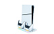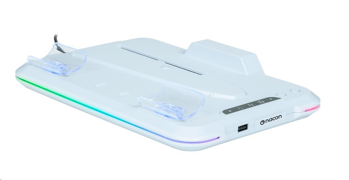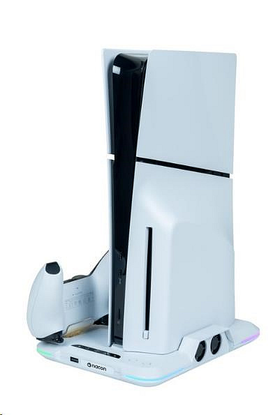 Umístěte svou herní konzoli PlayStation 5 Slim na tento víceúčelový vertikální podstavec od společnosti Nacon. Ten je kompatibilní s diskovou i digitální verzí této konzole a kromě dvou větráčků a jednoho portu USB-A na něm najdete také dvě kolébky sloužící k nabíjení herních ovladačů DualSense, přičemž o stavu jejich nabíjení vás informuje barevné podsvícení pod jednotlivými ovladači.