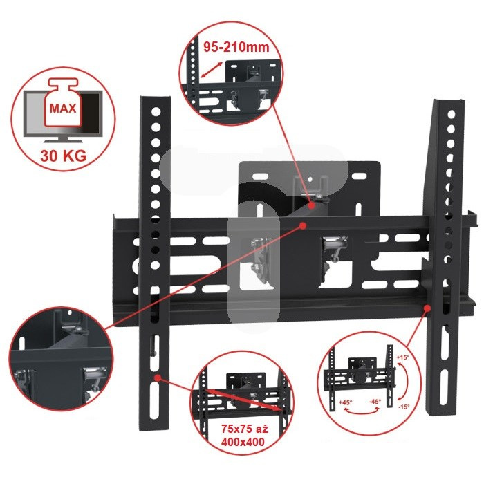 Nástěnný držák na Tv Fiber Mounts FM049 Otočný +/-45°, sklopný +/-15°, výsuvný 95-240mm, VESA, nosnost 30kg, na Tv 26-55" Nástěnný držák se středně velkou nástěnnou deskou pro spolehlivou instalaci na stěnu s lepším rozložením hmotnosti na větší ploše. Držák je vhodný na televize s úhlopříčkou 26" až 55", televizorem je možné po zavěšení na tento držák mírně otáčet do stran, naklápět a měnit vzdálenost od stěny. Ocelová konstrukce zajistí bezpečné zavěšení televizorů s hmotností až 30kg. Držák je vhodný na všechny typy a značky televizorů, které podporují VESA standard 75x75 až 400x400. Barevné provedení černé. LCD LED držák Tv pro uchycení na stěnu, otočný a sklopný, mírně výsuvný, velká instalační plocha Fiber moutns FM049 Technické údaje: nosnost 30kg podpora VESA standardu 75x75 až 400x400 vhodný na televize s úhlopříčkou 26" až 55" výsuvný, nastavitelná vzdálenost od zdi 95mm až 210mm naklápění televize nahoru nebo dolů až o 15° otáčení televizorem do stran až o 45° (dle velikosti Tv) velká instalační nástěnná plocha s rozměry 200mm x 145mm možnost ukotvení až na 8 hmoždinek ocelová konstrukce barevné provedení černé záruka 2 roky Ocelový robustní držák Tv na zeď Fiber Mounts FM049 Držák Tv Fiber Mounts FM049 podporuje VESA standardy: VESA 75x75 VESA 100x100 VESA 200x100 a 100x200 VESA 200x200 VESA 300x200 a 200x300 VESA 300x300 VESA 400x200 a 200x400 VESA 400x300 a 300x400 VESA 400x400 Nástěnný držák Fiber Mounts FM049 je vhodný pro zavěšení všech typů i značek televizorů, které podporují kterýkoliv z výše uvedených VESA standardů a jejichž hmotnost není vyšší jak 30kg..