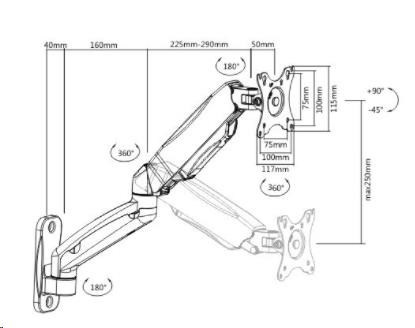 Držák na monitor Fiber Mounts FM31 Plně polohovatelný držák na monitor na zeď 17-43", nosnost 9kg Špičkový nástěnný držák pro zavěšení monitorů 17-43", který má neskutečný rozsah polohovatelnosti. Monitor zavěšený na držáku Fiber Mounts FM31 můžete otáčet do stran, vysunovat a přisouvat ke zdi, naklápět v obrovském rozsahu jak dolů, tak i nahoru, měnit výšku až o 25cm, rotovat (mít monitor klasicky na šířku nebo ho kdykoliv přetočit na výšku). Vynikající kvalita zaručuje dlouho životnost, plynový píst pro výškové polohování se velmi snadno nastavuje na potřebnou hmotnost. Držák je osazen krytkami pro vedení kabeláže. V balení naleznete sadu instalačního materiálu. Barevné provedení černé, záruka 2 roky. Držák na monitor Tv na zeď 17-43" s obrovskou škálou polohování Fiber Mounts FM31 Technické údaje: na monitory i televizory s hmotností 2-9kg VESA standard 75x75 a 100x100 (možnost rozšíření) doporučujeme na monitory i televizory s úhlopříčkou 17" až 43" vhodný na klasické rovné ale i prohnuté monitory a televizory otáčení do stran +/- 90° naklápění +90° / -45° výsuvný od zdi 90mm až 540mm rotace 360° systém pro vedení kabeláže špičková konstrukce snadné nastavení plynového pístu na požadovanou zátěž instalační materiál barevné provedení černé záruka 2 roky Držák na monitor televizi na zeď Fiber Mounts FM31 Držák na monitor na zeď Fiber Mounts FM31 podporuje VESA standardy: VESA 75x75 VESA 100x100.