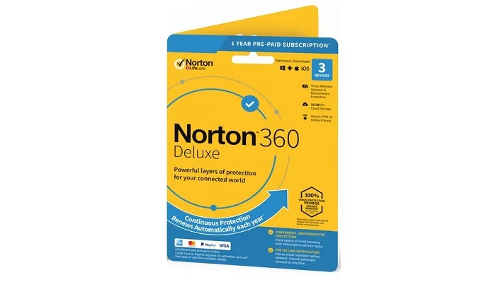 Symantec Norton 360 Deluxe je software pro ochranu před počítačovými viry a jinými škodlivými softwary. Je dodáván s cloudovým úložištěm o kapacitě 25 GB a Secure VPN. Licence je určena pro jednoho uživatele na 3 zařízení. Je platná po dobu 1 roku.