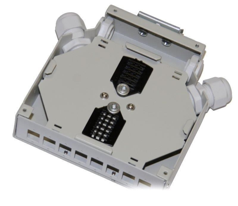 Optický rozvaděč na DIN lištu 8x SC simplex (8x LC duplex) s hřebínky na 16 svarů, bílýTyp příslušenství:Optické vany, rozvaděče.