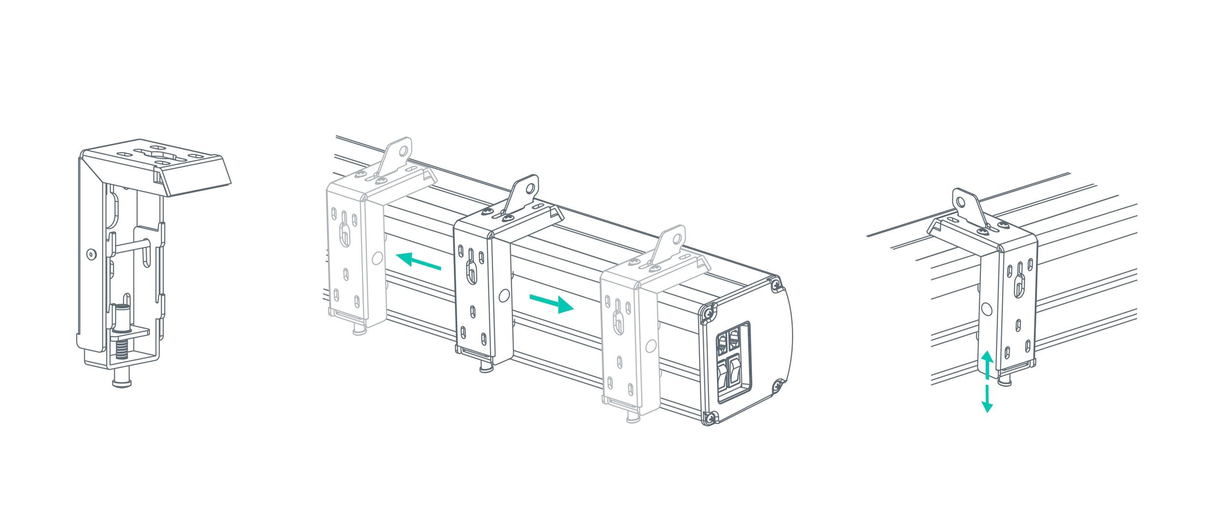 Dodáváno se dvěma malými držáky ve tvaru L, které lze umístit kdekoli po délce pouzdra. Ideální pro studniční stěny. Umožňuje také horizontální nastavení, což znamená, že můžete posouvat obrazovku doleva a doprava.