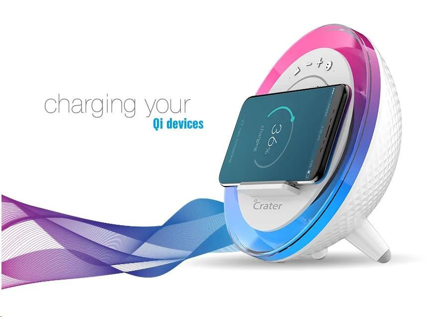 V neposlední řadě využijete Crater-9 také k dodání „šťávy“ pro váš smartphone. K nabíjení využívá bezdrátovou Qi technologii o výkonu 10 W, což je nejen pohodlné, rychlé, ale také šetrné. Vyhnete se hledání nabíjecího kabelu a jeho zbytečnému ohýbání a šetříte i nabíjecí porty mobilního telefonu. Smartfon stačí položit na vyznačenou plochu určenou k nabíjení, kde se vám mobil s podporou Qi technologie elegantně nabije třeba i při poslechu hudby nebo když už sladce spíte.