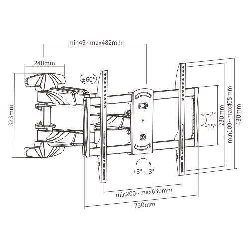 Otočný držák na televize Fiber Super-3Profesionální držák na Tv 43-75", otočný +/-60°, naklápění +2°/-15°, vzdálenost od zdi 49-482mm, korekce roviny, vedení kabeláže, VESA 200x100 až 600x400, nosnost 45kg.