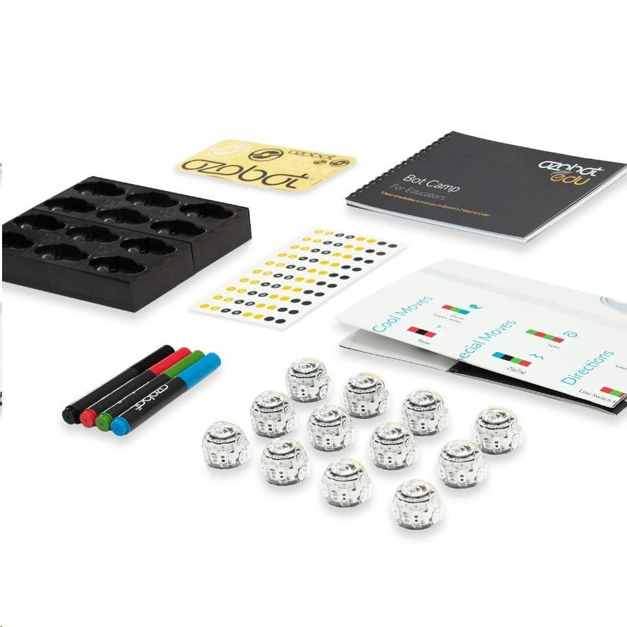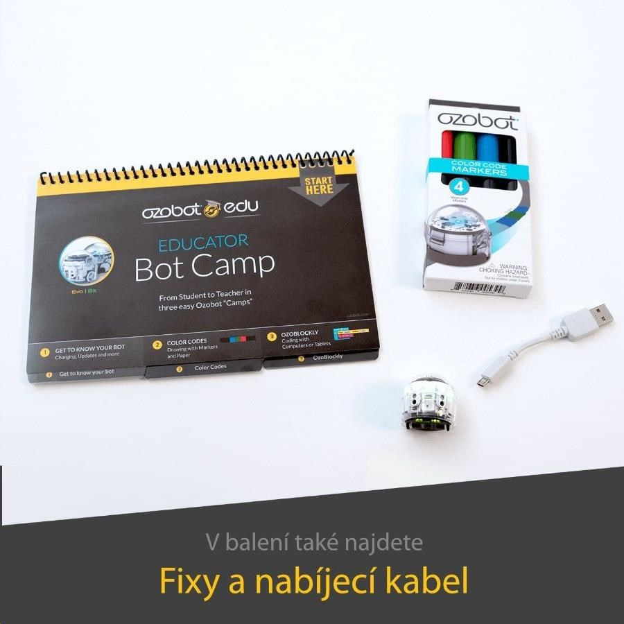 Tato sada pro školy a zájmové kroužky je vybavená vším, co potřebují velké týmy, aby se do kódování mohly hned pustit. Vedle 12 Ozobotů Evo v ní najdete i soubor aktivit, které vám pomohou do tajů programování hladce proniknout. Nechybí ani set 12 omyvatelných fix, které dětem usnadní do kreslení barevných kódů a vlastních spletitých drah. Šířka stopy popisovačů je přizpůsobená přímo senzorům malého bota. Ten se tak lépe orientuje na jejich trasách a nevyžaduje tak častou kalibraci. Radost malým programátorům určitě udělá i množství barevných samolepek. Novinkou je pak nabíjecí matrice, která se postará i o automatickou aktualizaci softwaru. Má nízký profil a skromné rozměry, aby nikdy nepřekážela. Součástí balení je AC/DC adaptér pro zapojení nabíjecí stanice do standardní elektrické zásuvky.