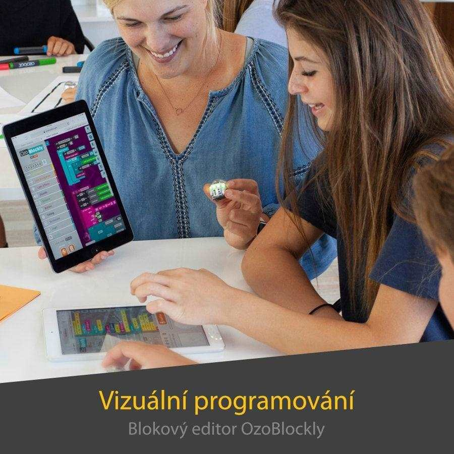 Jak už bylo zmíněno, děti i dospělí mohou kódovat Ozobot Evo dvěma způsoby. Pro začátek vám k programování stačí fixy a papír. Vaším úkolem bude nakreslit pro robota vodící černé linie, které by mohl sledovat. Na ně umístíte barevné kódy složené ze sekvence červených, zelených a modrých čtverečků. Ty robotovi určí směr, rychlost, spustí počítadlo nebo časovač, popřípadě mu dovolí předvést cool pohyby. Ozokódů, kterými dráhu můžete okořenit, existuje spoustu. A nebojte – nemusíte se je učit zpaměti. Jejich přehled můžete mít vy i děti neustále po ruce. Věnujete se malým dětem, pro které by i kreslení drah s barevnými kódy mohlo být obtížné? Chcete ušetřit množství spotřebovaného papíru? Základní startovací kit můžete rozšířit o sadu magnetů, které je perfektně zastoupí.Další možností je vizuální programování v aplikaci či online blokových editorech Ozobot Blockly a Ozobot Editor. V tomto velmi intuitivním prostředí mohou hlavně starší žáci řadit za sebou jednotlivé bloky s pohyby, zvuky, světelnými efekty, smyčkami a časovači a vytvářet přitom jejich unikátní kombinace. Složitost jednotlivých úkonů je přehledně rozdělena do celkem 5 úrovní, aby si každý malý programátor mohl vybrat tu svou. Vaše originální programy pak nahrajete přímo do bota a necháte ho převést je v akci. Nově lze celé prostředí editoru přepnout do jazyka Python a naučit studenty používat i tento programovací jazyk. Ať už zvolíte jakoukoliv metodu, procvičíte si své dovednosti tvořit posloupnosti, příkazy, pracovat s logikou a posilovat schopnost řešit problémy.