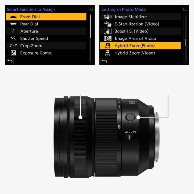V rámci řady LUMIX S nabízí objektiv možnost přepínání funkcí přímo pomocí ovládacího kroužku. Kroužek pro manuální ostření tak může sloužit i jako přizpůsobitelný ovládací prvek, například pro nastavení clony nebo kompenzace expozice. Navíc si můžete zvolit směr otáčení podle svých zvyklostí. Součástí objektivu je také samostatné tlačítko ostření, které umožňuje rychlý přístup k funkcím jako hybridní zoom, jenž kombinuje optické přiblížení s digitálním výřezem a rozšiřuje tak možnosti záběru bez nutnosti měnit ohniskovou vzdálenost.