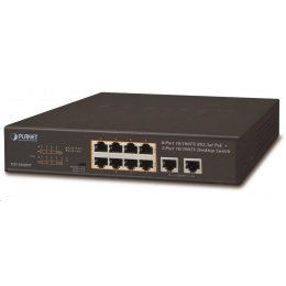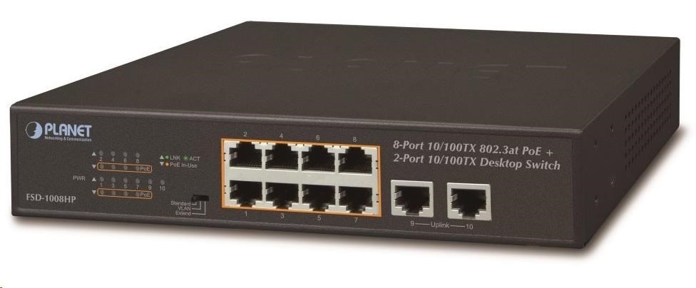 Planet FSD-1008HP Switch, PoE 8x PoE 802.3at 120W+ 2x 100Base-TX,VLAN,extend mód 10Mb/s do 250m, fanless