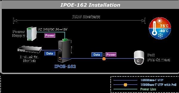 Planet IPOE-162 napájení po ethernetu IEEE802.3at, 30W, Gigabit, DIN, IP30, -40 až 75 CPrůmyslový injektor pro napájení po Ethernetovém kabelu, standard IEEE 802.3at do příkonu až 30W. Pracuje i na Gigabitovém propojení. Krytí IP30, hliníková skříň, pracovní teplota -40 až 75°C, montáž na DIN lištu nebo přímo na zeď..