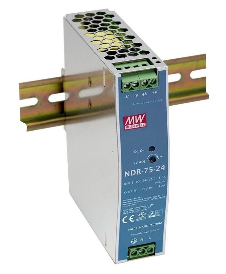 Napájecí zdroj pro instalaci na DIN lištu. Výstupní napětí nastavitelné DC 48-56V, zatížitelnost 75W. Provozní teplota -10 až 60°C. ZÁKLADNÍ SPECIFIKACE Výstupní obvod: Výstupní napětí: 48-56V DC Výstupní proud: 1,6 A Celkový výstupní výkon: 75 W Ochranné prvky: zkrat, přetížení, přepětí a přehřátí Typ připojení: šroubová svorkovnice Vstupní obvod: Vstupní napětí: 100-240V AC,50/60Hz, 1.45A Typ připojení: šroubová svorkovnice Mechanické vlastnosti: Materiál: kovová skříň, perforovaná Rozměry: 125 x 102 x 35 mm Hmotnost: 510 g Montáž: DIN lišta.