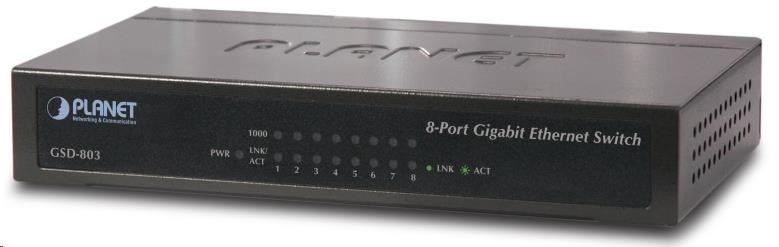 Planet switch GSD-803 10/100/1000 (8X1000BASE-T), EUP, 802.3AZ, kov8-mi portový Gigabitový desktopový přepínač. Autodetekce rychlosti a typu kabelu. Kovová skříň. Energeticky efektivní ethernet zařízení podle 802.3az a EuP.