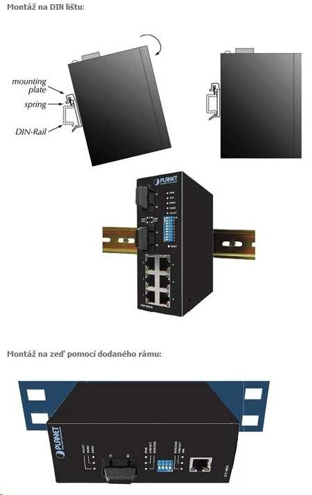 Planet switch IGS-801M, 8X 1000BASE-T, DIN, IP30, -10 AŽ 60°C, ESD+EFT DO 6KV, WEB/SNMP, VLAN, STP8-mi portový 1000Base-T spravovatelný přepínač a konvertor pro průmyslové aplikace. Redundance datového propojení s 300ms zotavením. Web//SNMP management, 64 VLAN 802.1Q sítí, Spanning Tree, agregace linek IEEE 802.3ad LACP. Možnost redundantního napájení v rozsahu 12-48V DC, krytí IP30, hliníková skříň, pracovní teplota -10~60°C. Přepěťová ochrana LAN i napájecích portů do 6kV. Montáž na DIN lištu nebo přímo na zeď..