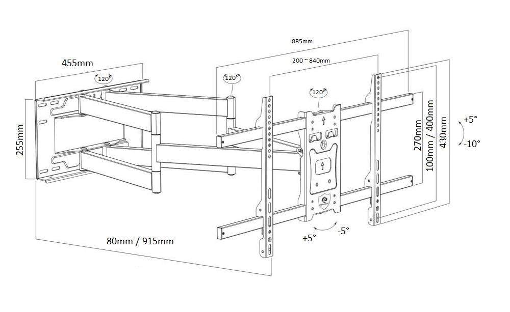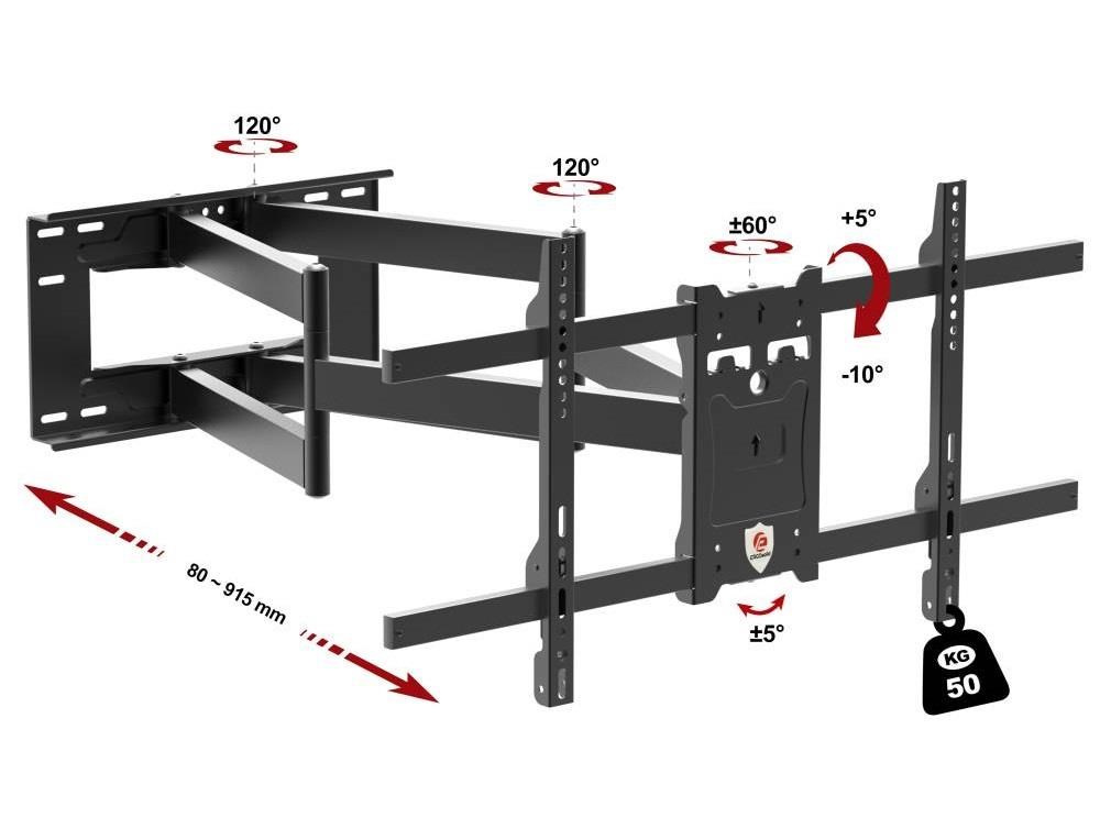 Poctivý výsuvný otočný a sklopný držák Tv Ergosolid ONYX-30Kvalitní nástěnný držák na Tv 43-90", výsuvný 80-915mm, otočný +/-65°, náklon +5°/-10°, korekce roviny +/-5°, VESA 200x100 až 800x400, nosnost 50kg.