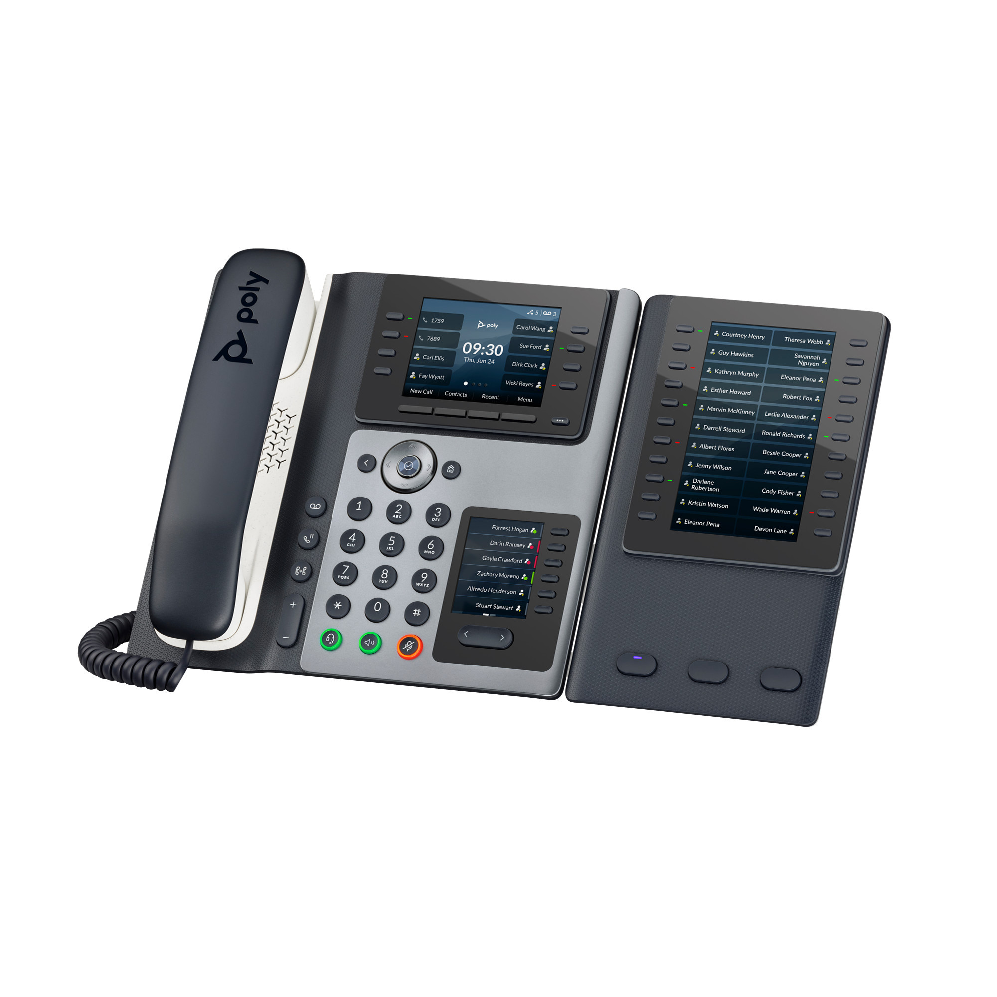 | Audio | Poly HD Voice; Technologie Poly Acoustic Clarity zajišťuje plně duplexní hovory a potlačuje akustickou ozvěnu i okolní šum; Technologie Poly Acoustic Fence potlačuje okolní hluk při použití sluchátka nebo kabelové náhlavní soupravy; Technologie Poly NoiseBlockAI odstraňuje většinu okolního hluku při používání konferenčního reproduktoru; Aplikace Poly Computer Audio Connector nainstalovaná v počítači (pouze Windows) umožňuje vybrat telefon pro zvukový vstup a výstup počítače a použít s počítačovými aplikacemi sluchátka, volitelné náhlavní soupravy a handsfree hlasitého odposlechu; Design s vylepšenými basy; Širokopásmový zvuk TIA-920, v souladu s typem 1 (plně duplexní IEEE 1329); Individuální nastavení hlasitosti s vizuální zpětnou vazbou pro každou zvukovou cestu; Detekce hlasové aktivity; Komfortní tvorba hluku; Generování tónů DTMF (RFC 2833 a v pásmu); Přenos zvukových paketů s nízkým zpožděním; Adaptivní paměti pro vyrovnání zpoždění |