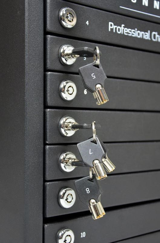 Originální napájecí skřínka s funkcí dobíjení a individuálních zámků pro každé zařízení zvlášt.