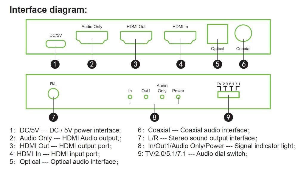 Extraktor umožňuje oddělit audio signál z HDMI vstupu na analogový nebo digitální výstup, který je vyveden na konektory: StereoJack 3,5mm, Digitální audio RCA CINCH, Digitální optický TOSLINK (SPDIF) nebo HDMI vyhrazený pro audio výstup.