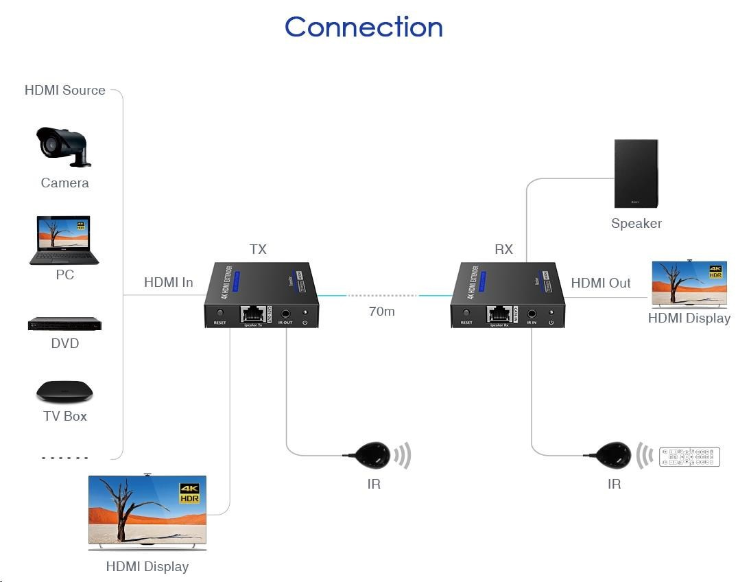 - HDMI signál lze přenášet až do 70m přes kabel Cat.6 / 6A / 7; až 40 m na kabelu Cat.5E