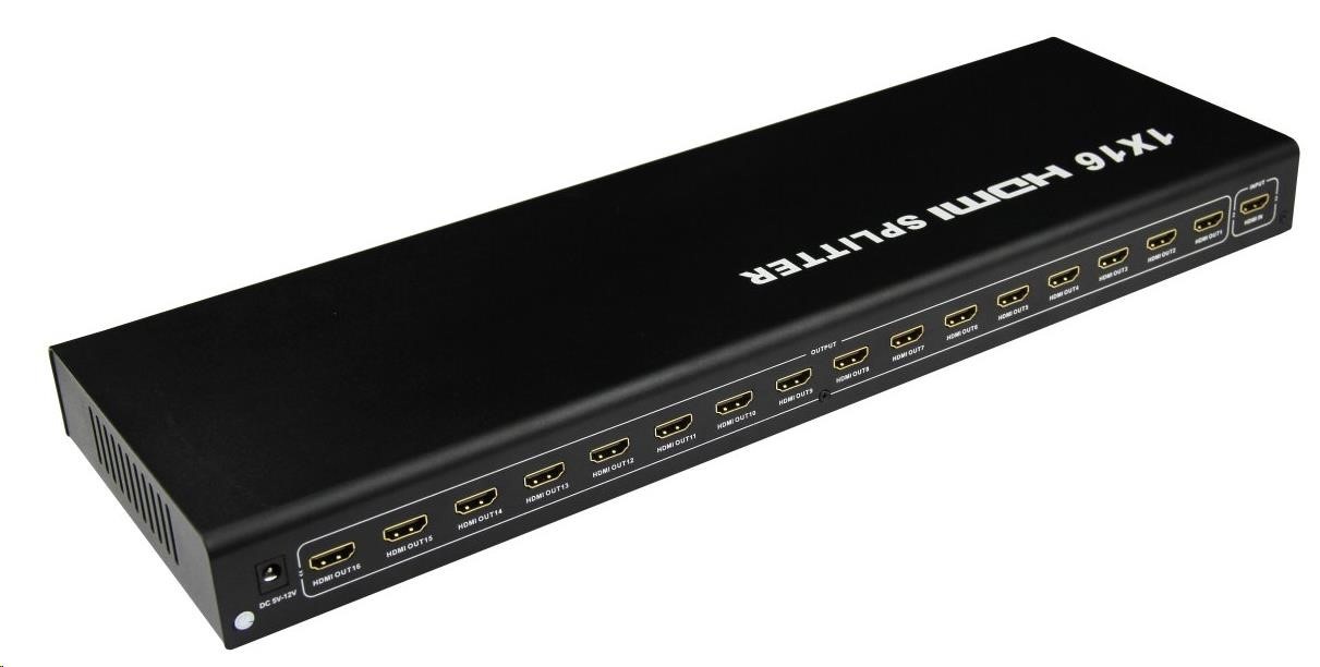 HDMI Video Splitter 1 => 16 s externím napájecím zdrojem, HDMI 1.4a kompatibilní max. rozlišení 1080i a 1080p. Můžete připojit několik HDMI obrazovek k jednomu HDMI zdroji signálu. - kompatibilní s DTV 480i, 480p, 720i, 720p, 1080i and 1080p - podpora VGA, SVGA, XGA a UXGA - HDMI 1.4a - podporuje Full 3D - HDCP ready - indikace stavu LED diodami - napájecí adaptér na 230V v sadě - přenáší obraz i zvuk - podpora až 15m HDMI kabelu na vstupu a 25m HDMI kabelu na výstupu. (zesiluje HDMI signál) - kovové pouzdro pro lepší odvod tepla Pokud se obraz po zapojení rozbočovače nezobrazí ihned po zapojení, vyčkejte cca 30s než dojde k rozpoznání signálu..