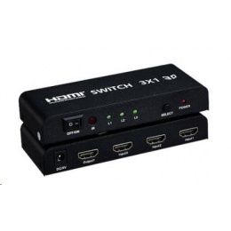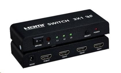HDMI switch 3:1 s dálkovým ovladačem 3 HDMI zařízení sdílí 1 HDMI výstupní zařízení (obrazovku). Výběr zařízení tlačítkem nebo dálkovým ovládáním. Podpora 20m HDMI kabelu na vstupu,10m HDMI kabelu na výstupu HDMI switche - HDMI rolišení 480i, 480p, 720i, 720p,1080i a 1080p - Podpora modů VGA,SVGA,XGA,UXGA mode - Podporuje datový tok 2.5Gbps a frekvenci až 250MHz - Podporuje standard HDMI1.4A - Nejvyšší rozlišení FULL HD 1080p/60Hz - 8bit,10bit,a 12bit barevná hloubka na kanál - Výběr vstupu tlačítkem/dálkovým ovládáním - Plug-and-play, není třeba software. - HDCP kompatibilní - V sadě dálkové ovládání pro komfortní obsluhu - Podpora 3D obrazu - Podpora FULL HD - Přídavný adaptér 230V/5V, 1A v sadě.