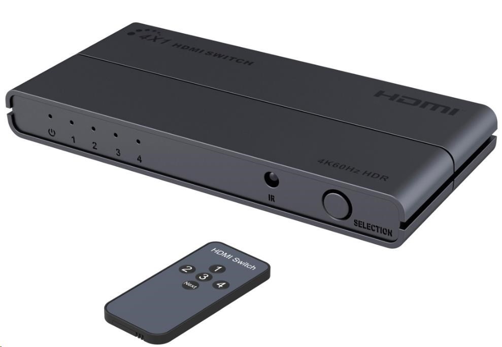 PREMIUMCORD HDMI switch 4:1 s podporou rozlišení 4Kx2K@60Hz, 1080P, HDR, s ovládáním tlačítkem a dálkovým ovladačem
