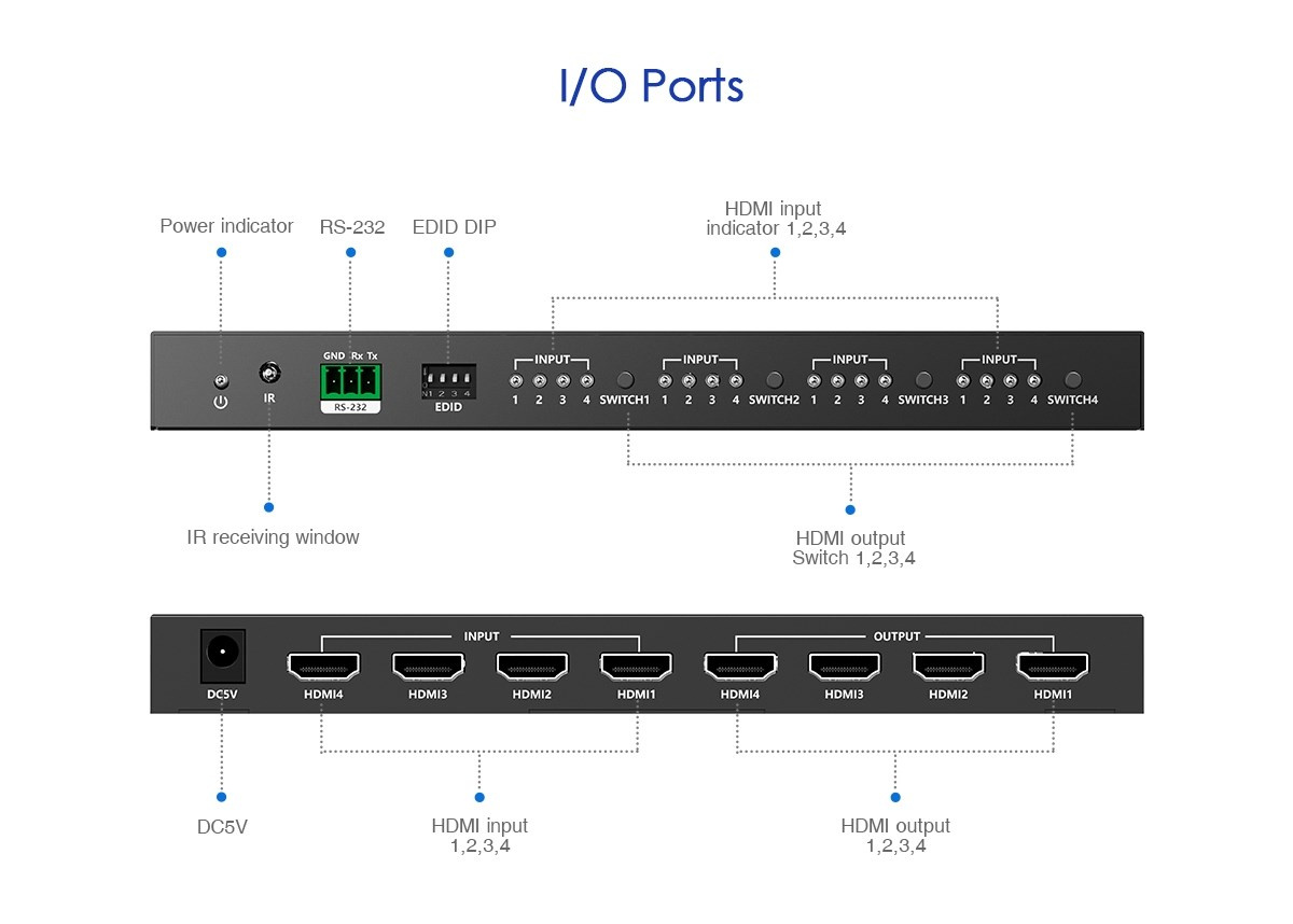 HDMI matrix switch 4:4, umožní propojit až čtyři zdroje signálu HDMI na 4 výstupy HDMI, umožní zapojit například PC+DVD přehrávač+BlueRay k jednomu vybranému monitoru ze čtyřech.