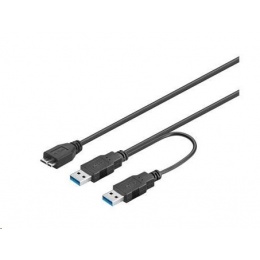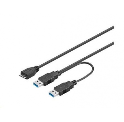 PremiumCord USB 3.0 napájecí Y kabel A/M + A/M -- Micro B/M - USB 3.0 kabel SuperSpeed - Dvojité napájení pro externí 2,5" HDD nebo jiné zařízení vybavené Micro USB B konektorem. - Konektory: vstup dva konektory USB 3.0 A male pro zapojení do počítače, výstupní konektor Micro USB B male - Přenosová rychlost: Super-speed 5Gbps, až 10x rychlejší než standardní USB2.0 - Zalévané konektory - Barva: černá - Délka: 30cm.