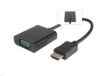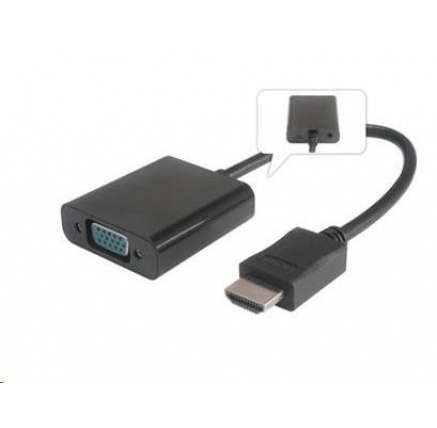 Převodník HDMI na VGA s audiem 3,5mm stereon jack - černý - Vstup: HDMI konektor - male - Výstup: VGA konektor DB15 - female a audio výstup 3,5mm stereo jack - Převodník umožňuje propojit zařízení s výstupním signálem HDMI na zobrazovací zařízení nebo TV, monitor s VGA konektorem a audio stereo jack 3,5mm - Podporuje: HDCP1.0/1.1/1.2; HDMI1.1/1.2/1.3/1.4 - Technologie Plug and play; - Podporuje rozlišení: 480i/576i / 480p / 576p / 720p/1080i / 1080p / 60Hz; VGA výstup: 480i/576i / 480p / 576p / 720p/1080i / 1080p / 60Hz/ WUXGA 1920x1200@60Hz a 1920x1080@60Hz - Podporuje FULL HD 1080P (1920*1080P@60Hz) a WUXGA 1920x1080@60Hz. - Podporuje dvou kanálový zvuk IIS/ S/PDIF přes 3.5mm audio konektor - Napájení s HDMI (5V) - V případě nutnosti, pokud nestačí napájení z HDMI portu, použijte napájení adaptéru pomocí USB kabelu s micro USB konektorem, který zapojíte na zadní straně adaptéru (např. ku2m05f) Dálší možností přídavného napájení je použít napájecí adaptér 230V - 5V/1A s micro USB konektorem (ppadapter-44) - Adaptér je určen pro počítače nebo notebooky s výstupem HDMI, pro převod obrazu na analogové VGA. - Rozměry: 45mm x 41mm x 14mm (VGA kryt) - Délka 20cm - Váha: 34g - Barva: černá.