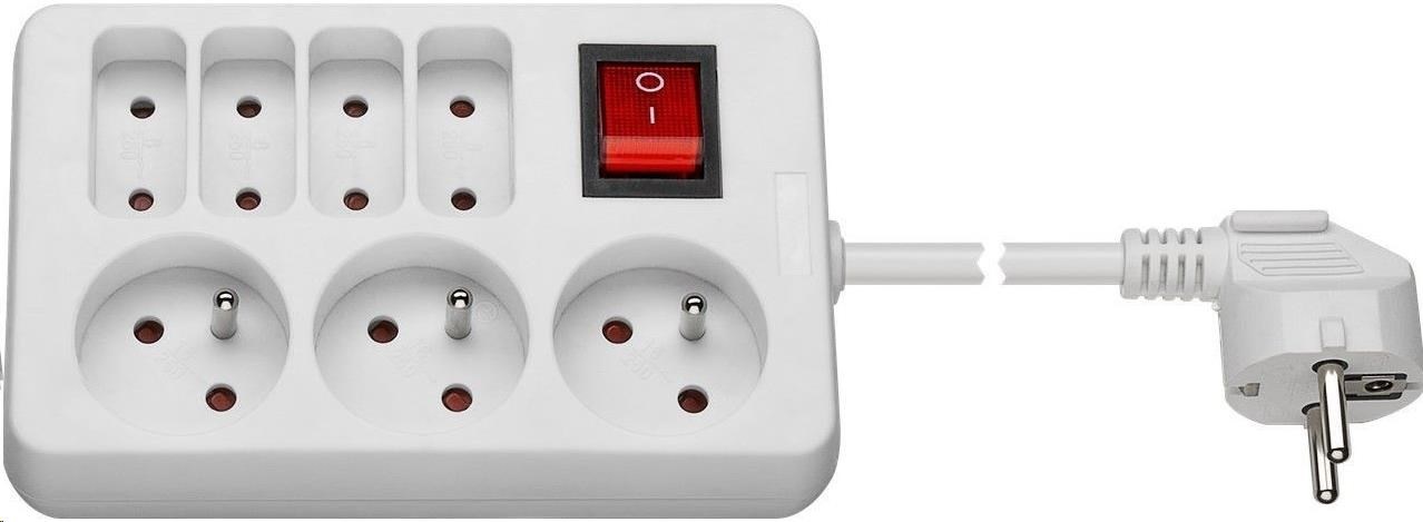 PremiumCord Prodlužovací přívod 230V 1,5m 3+4 zásuvky+vypínač - Počet zásuvek: 3 kulaté zásuvky, 4 ploché zásuvky - Max.napětí: 250 V, max. 10A - Kabel H05VV-F 3G 1,5 mm2 - Kolébkový vypínač s indikací zapnutí - Dětská pojistka - Barva: bílá - Baleno v PE sáčku se závěsným systémem. - Délka kabelu:1,5m.