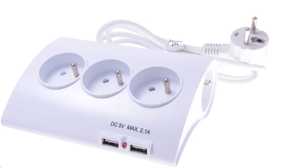 PremiumCord Prodlužovací přívod 230V 1,5m 5zásuvek+vypínač+2x USB nabíjecí proud 2A - Počet zásuvek:5 , 2 zásuvky z boku, 3 zásuvky nahoře - 2x USB port pro nabíjení proudem až 2.1A - Max.napětí: 250 V, max. 16A - Kolébkový vypínač umístěný zezadu. - Led kontrolka pro zapnutí - Dětská pojistka - Proudová pojistka - Barva: bílá - Baleno v PE sáčku se závěsným systémem. - Délka kabelu:1,5m.