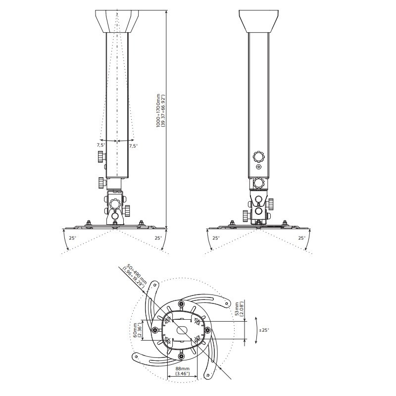 Profesionální designový stropní držák na projektor EDBAK PMV300Délkově nastavitelný 100-170cm stropní držák projektoru, nosnost 15kg, náklopný.