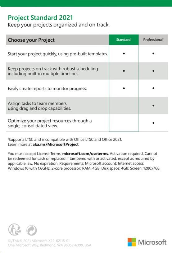 Project Standard 2021 CZPro koho je licence určena:Komerční; Jazyk:Český; Způsob licencování:Plná verze; Typ licence:Krabice; Produktová řada:Office Standard.
